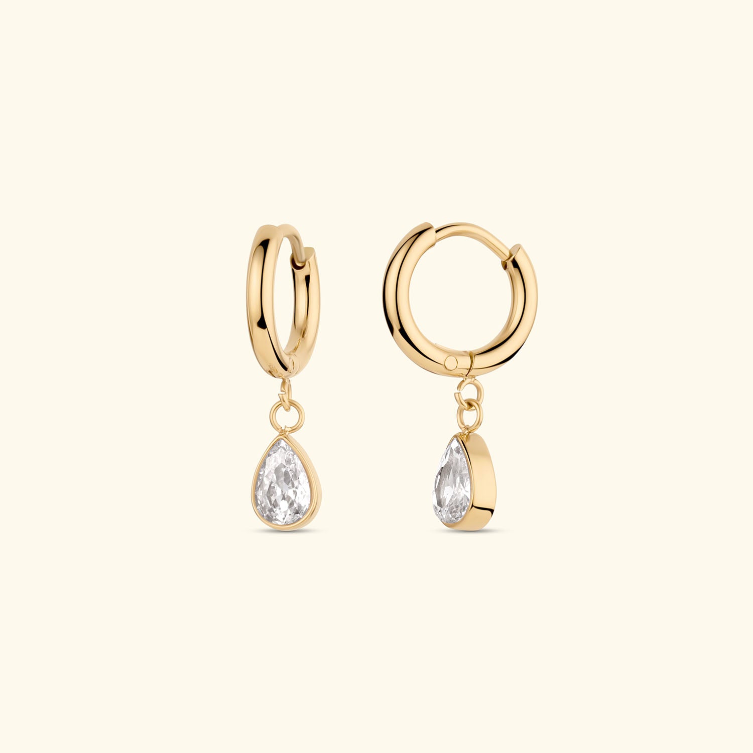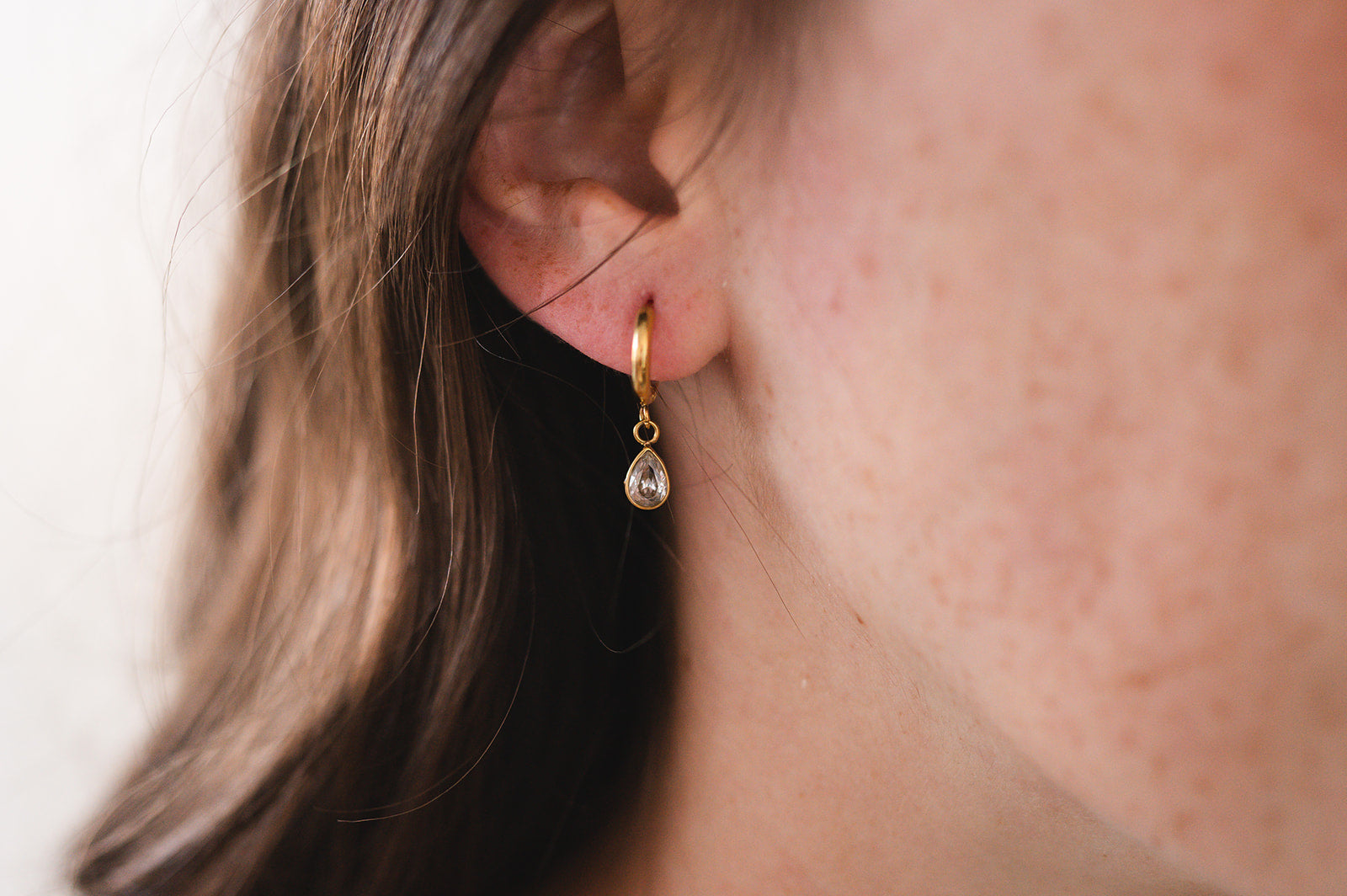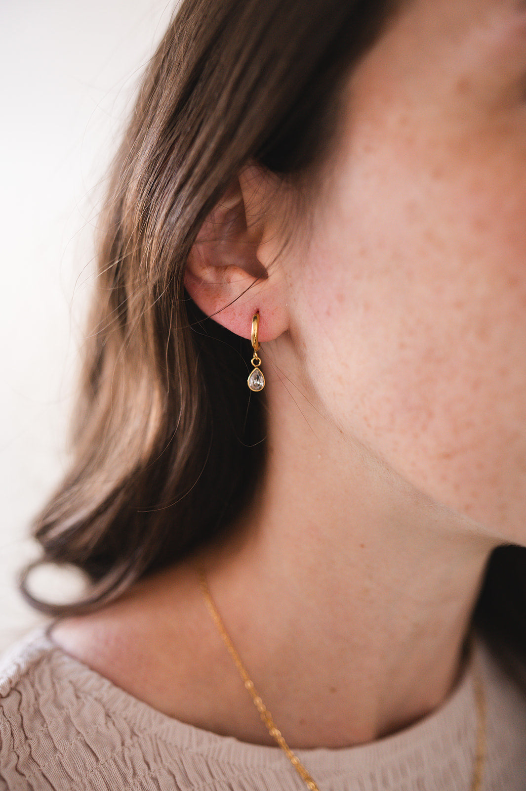 Save those tears for another day girl, cuz these little beauties are calling your name, and are bound to put a smile on your face!  Features a small huggie hoop with a gorgeous tear-drop charm attached.  Elegant, classy, timeless.