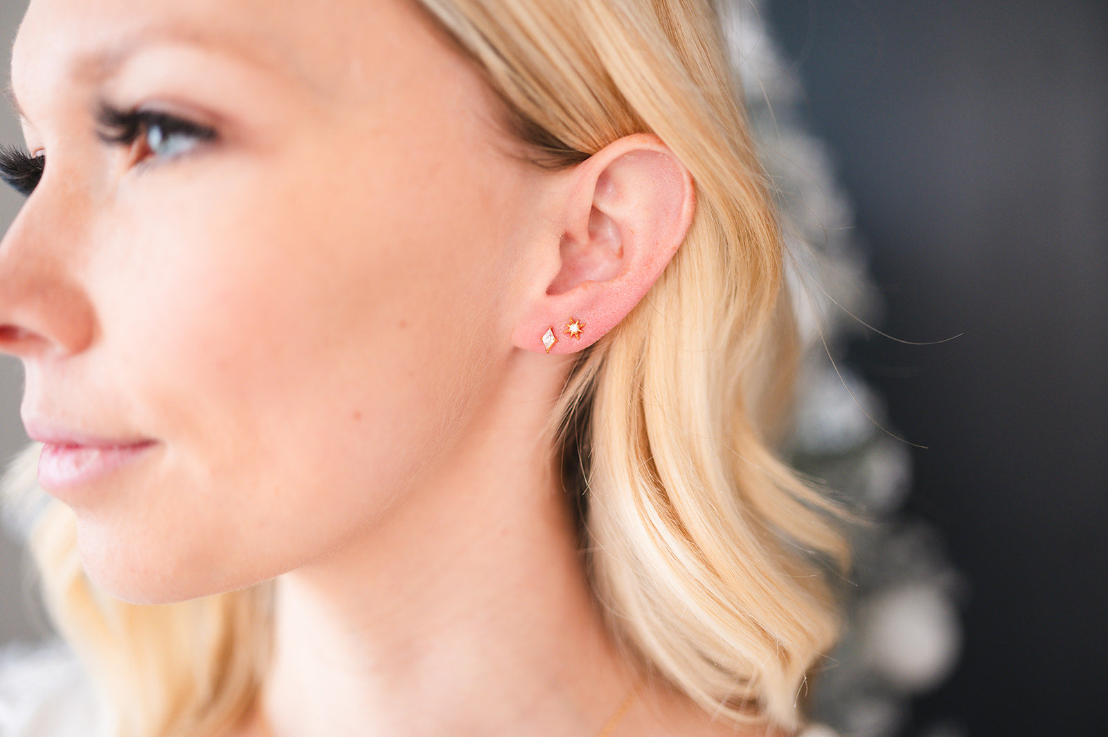 This set features a rhombus shaped diamond sleeper stud (you asked and we delivered with a screw-on back for this set!) Also comes with a dainty little chain that can be removed and/or paired with a second piercing, as well as a gold bar that can be worn with any of our other sleeper studs, including our Halo Backdrop set!  We can't get enough of the endless ways to mix and match!